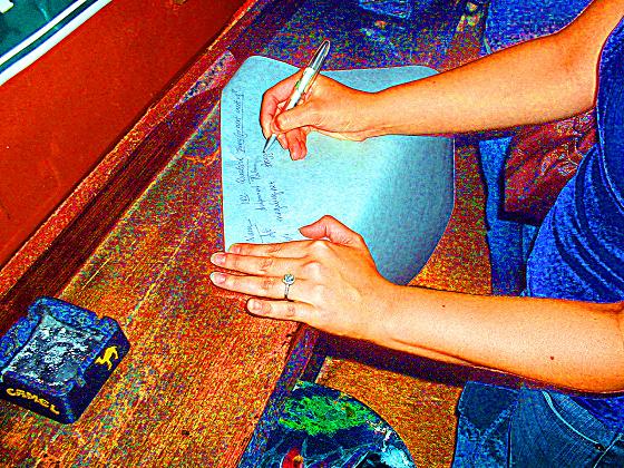 I stood in front of the carved wooden man and took in the scene. Duane was discussing his counter tops. David was talking about the Olympics, and a discussion ensued about what events were in the Decathlon. I wandered over to the side, and talked to Mr. and Mrs. Chutney about Frank Zappa and bands that don’t do well in concert. The napkin began to be passed around, only this time it was on solid paper. The medium is the message. Before long, the blogging crowd was leaving, and I left my third cup of coffee unfinished on a bar.