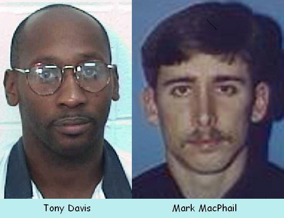 Mr. Davis is accused of the Murder of Mark MacPhail. As Wikipedia describes the incident: Mark Allen MacPhail, a 27 year old Savannah, Georgia police officer, was moonlighting as a security guard at a bus station in Georgia in the early hours of 19 August 1989. He was shot attempting to break up a melee in a Burger King parking lot. In full uniform he ran to stop a man who was striking a homeless man, Larry Young, with a .38 pistol. The assailant ran off. When MacPhail called out for him to stop, the assailant shot him under his bullet-proof vest and then in the head as he fell.