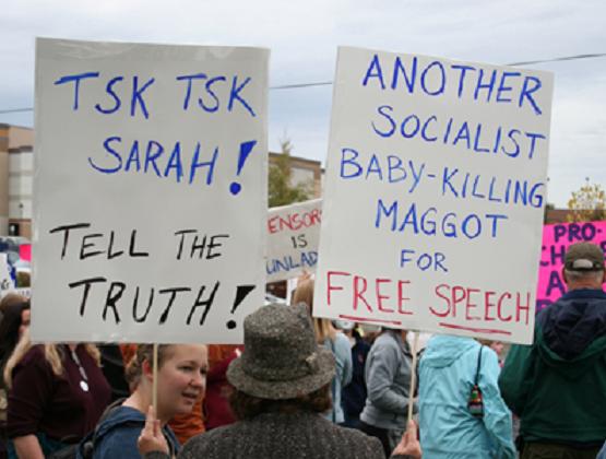 Yesterday Sarah Palin went back to Alaska. There was a rally of her fans. And another rally of those who are not fans.