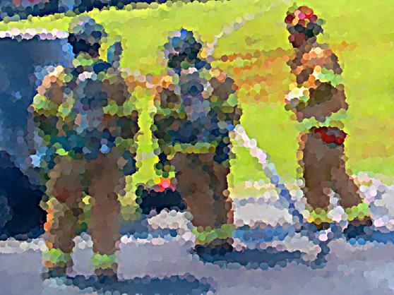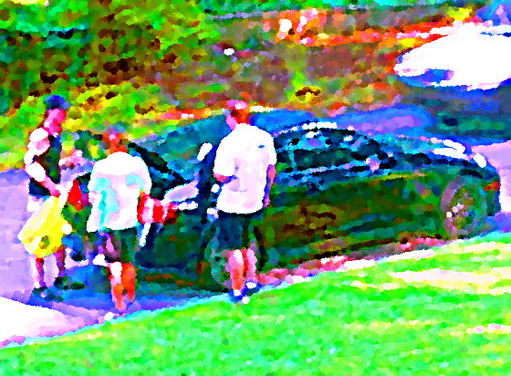 As PG and Uzi peaked the last hill, past the concrete cartoon characters, the organization reared its head again. A group of people were building a shelter. This would compliment the dozen or so amphitheaters, picnic shelters, and gazebos already there. As PG went up to the recently painted mens room, a lady invited Uzi to come out and help build something.