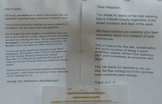 PG would not want to be a judge in this case. The first note was snide, and made a threat to “stop the flow coming out of the sprinkler head ourselves”. The second note was just as uppity.