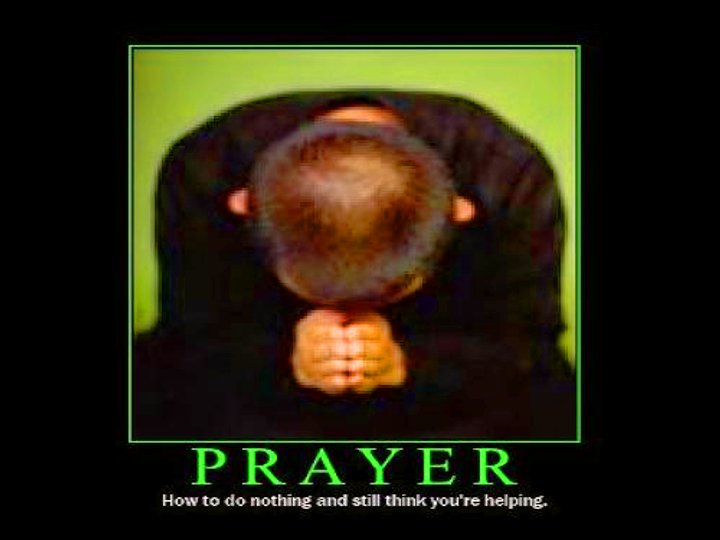 Now, prayer is not a completely bad thing. One of the cherished memories of my father is the brief, commonsense blessings he would give before meals. In the context of a church service, prayer plays a useful function. Some famous prayers are beautiful poetry. In Islam, the daily prayers are an important part of the observance. Who am I to say it is wrong? ( A note to the Muslim haters…We are all G-d’s children)