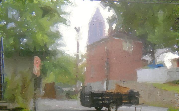 A dance studio, on the other side of a courtyard, was the site for the second image. It was in a narrow alley, with a locked gate at one end. It was a nice enough image, but you could not back up and get a good overall view. Visibility was also an issue at Twain’s, where a vehicle was parked in front.