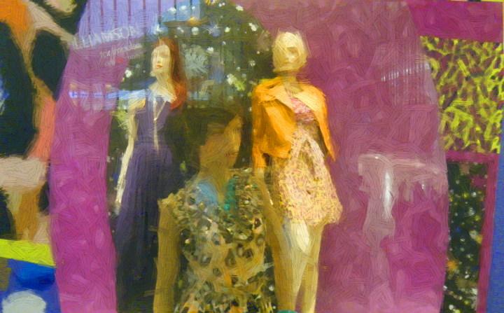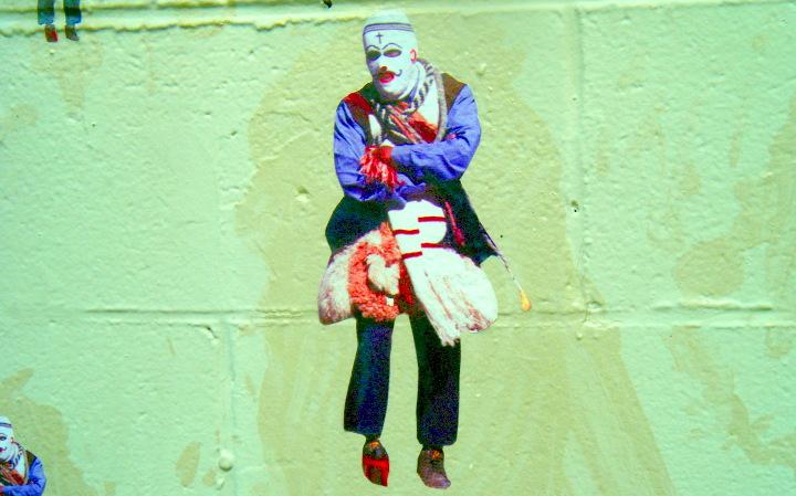 College Avenue runs by the railroad/Marta tracks, past Agnes Scott towards the city. A business had a mural on the side, with the painter still working on it. The journey went down East Lake Drive, past the home of the late Hosea Williams, and into Kirkwood. A very, very subtle display was on the side of a business. PG drove around the block three times, and was going to give up, when Uzi saw something. It was a collection of pasted up images of a man in a fantasy costume.