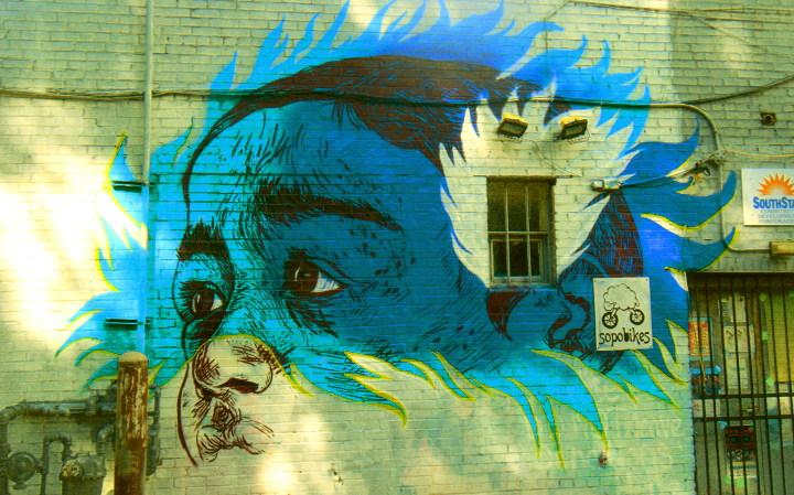 The next stop was the beltline. A building near Cabbagetown had a vibrant mural on the side. In East Atlanta, a Bicycle Co-op had a face drawing, to go with the security equipment of his neighbor. A run up Moreland took the explorers to Arizona Avenue, where some traditional graffiti graced a wall.