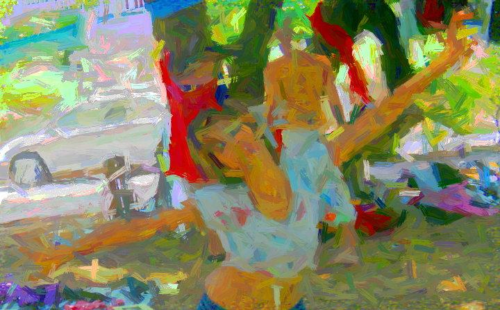 The Beacon Hill Recreation Center, an old school house, was at 430 W. Trinity, and was the correct location. PG drove in back, and looked for a place to park. He turned a corner, and found a fence at the back of the police station parking lot. A fence is more effective than a sign for blocking access. PG tried to turn around in a rather narrow space, and wound up with a curb in between his front and back tire. Several delicate front and back moves, and the vehicle was free to leave. It drove by a group of people doing exercises in a back yard. The murals were in a space on the building formerly occupied by a window. One of them was PG’s favorite image, to this point. It was not technically special, but had a happy vibe, and used the space efficiently.