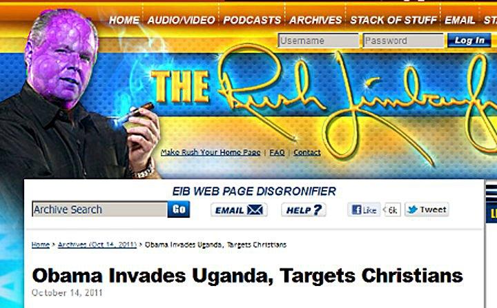 On October 14, 2011, the EIB WEB PAGE DISGRONIFIER was published at the internet home of The Rush Limbaugh Show.. The headline was “Obama Invades Uganda, Targets Christians”. (BTW, Kenya does share a border with Uganda.) In the transcript, we see “So that’s a new war, a hundred troops to wipe out Christians in Sudan, Uganda, and… no, I’m not kidding.” The dittoheads launched a twitter offensive, braving the disdain of the liberal media.