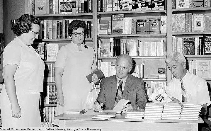 Whatever you might say about Lester Maddox…and there is no shortage of bad things to say…there has never been a public official that entertaining. As for being a tough act to follow, the next Governor was Jimmy Carter. As for the weatherman, PG saw him in a parking lot once. It was raining heavily. The “Gray Ghost” looked at PG with an ironic smile, as if to say “I am sorry”. The weatherman, Guy Sharpe, is on the right in the picture below this post. He is signing a book.