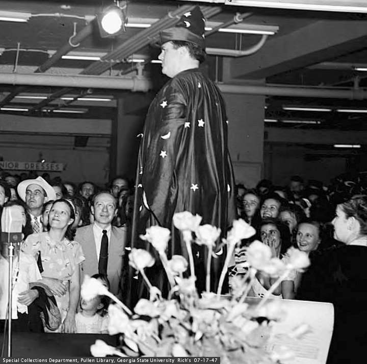 Years ago, a couple of years after the first reading of SF, PG worked at a department store called Davisons. They had these fabulous freight elevators, which you controlled by turning a brass knob. If wanted to go up, you turned left. If you wanted it to go down, you turned right. One of these elevators used to have a wooden gate in front of it. One day, a man stuck his head in the shaft to see if the elevator was coming. The elevator car cut his head off. The blood stains remained, between the third and fourth floors of the number 10 elevator.