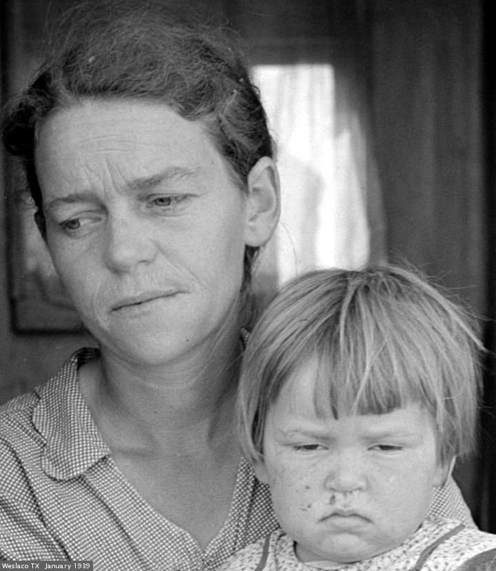 It is perhaps the most famous photograph from the depression. . The semi official title is Migrant Mother. The Library of Congress says “Destitute pea pickers in California. Mother of seven children. Age thirty-two. Nipomo, California.” The exact date is unknown, and was either February or March of 1936. The photographer was Dorothea Lange (pronounced dore-THEE-ah lang). The model was Florence Owens Thompson .