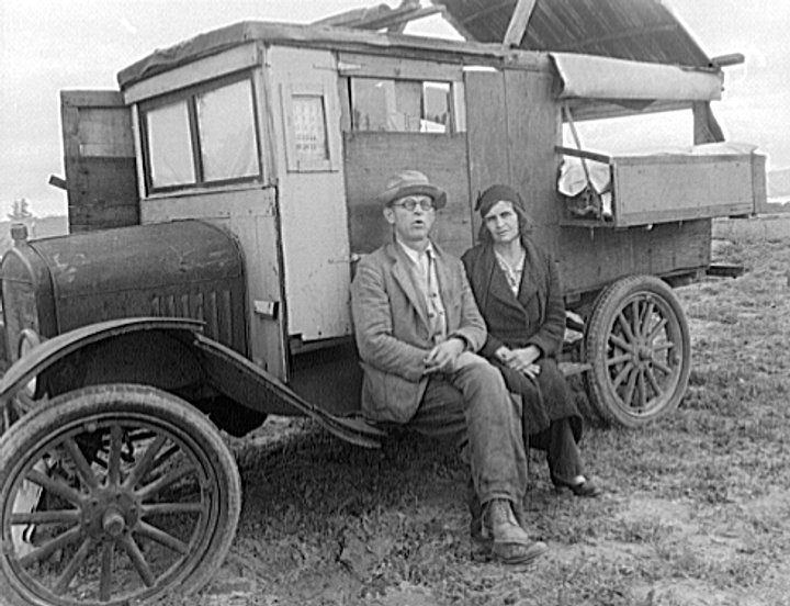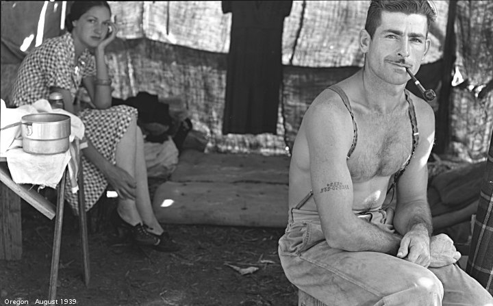 The day Lange photographed Thompson, she and her family were driving towards Watsonville, hoping to pick lettuce in the Pajaro Valley. The timing chain on their car broke just outside Nipomo, and so they pulled into the pea -pickers camp to fix it. While fixing the chain, the radiator was punctured; Thompson’s two boys (and likely her male companion) (Wikipedia says it was husband Jim Hill) brought the radiator into town to be fixed. While they were gone, Lange arrived…