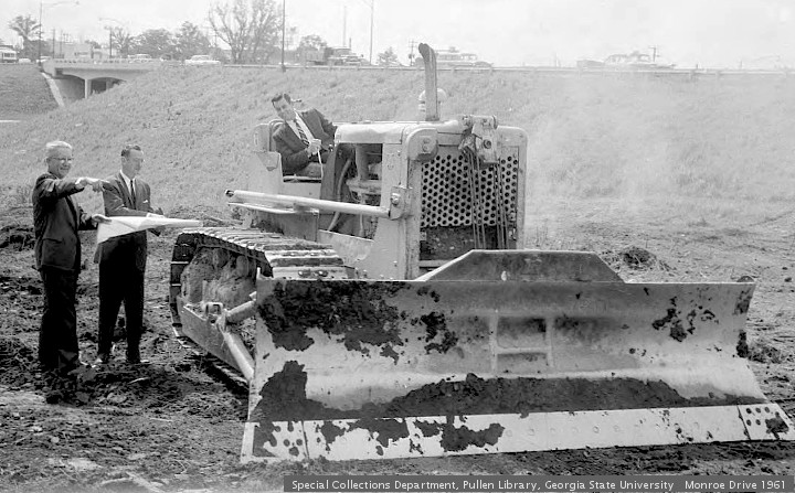 No one seems to know when this Monroe/Boulevard thing happened. An 1892 “Bird’s eye view” shows Boulevard sailing off into the horizon, past a racetrack in today’s Piedmont Park. A 1911 map shows Boulevard starting near “L.P. Grant Park,” and sailing past Ponce up to Piedmont Park. A 1940 map shows Boulevard going past Park Drive, only to turn into Monroe Drive at Montgomery Ferry Road. Finally, a 1969 map of “Negro Residential Areas” shows Monroe Drive changing into Boulevard at Ponce De Leon Avenue, like it is today. Boulevard is a stand alone street name at all times.