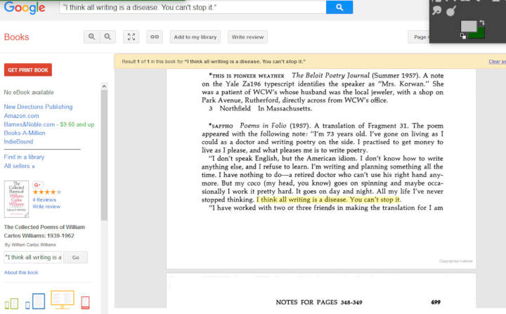 @simpsonlibrary posted a tasteful graphic featuring this quote: “I think all writing is a disease. You can’t stop it.” William Carlos Williams. PG had never heard of Dr. Williams, and thought the quote was real. Usually, the less famous the name, the greater the chance that the quote is legitimate. A bit of research turned up page 498 of The Collected Poems of William Carlos Williams: 1939-1962. Dr. Williams had translated Fragment 31 of Poems in Folio, by Sappho. “I’m 73 years old. I’ve gone on living as I could as a doctor, and writing poetry on the side. I practised to get money to live as I please, and what pleases me is to write poetry.”