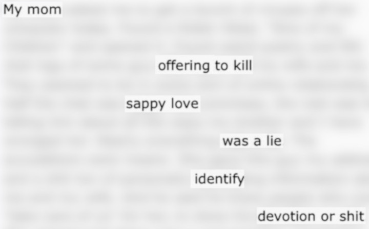 I ran into the garage and found my uncle’s shotgun, sitting there, waiting for me, beckoning, saying, “Go ahead, make these fuckers pay.” ~ “Hi Mom!” I shouted as I pulled the trigger, I started laughing uncontrollably as I continued firing at my family until I was empty.