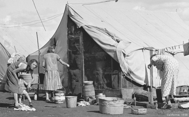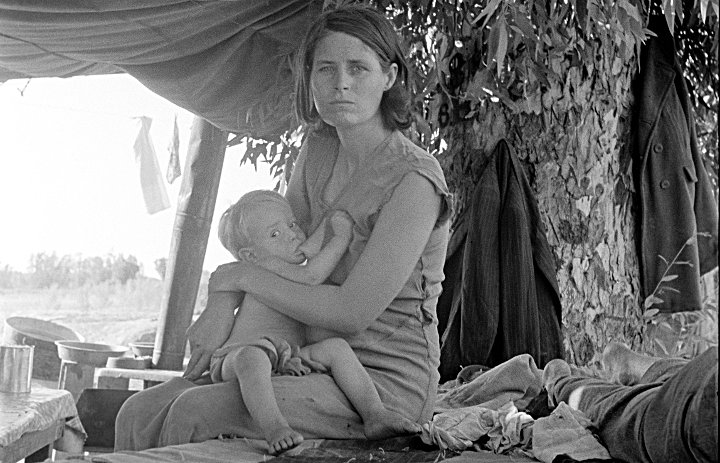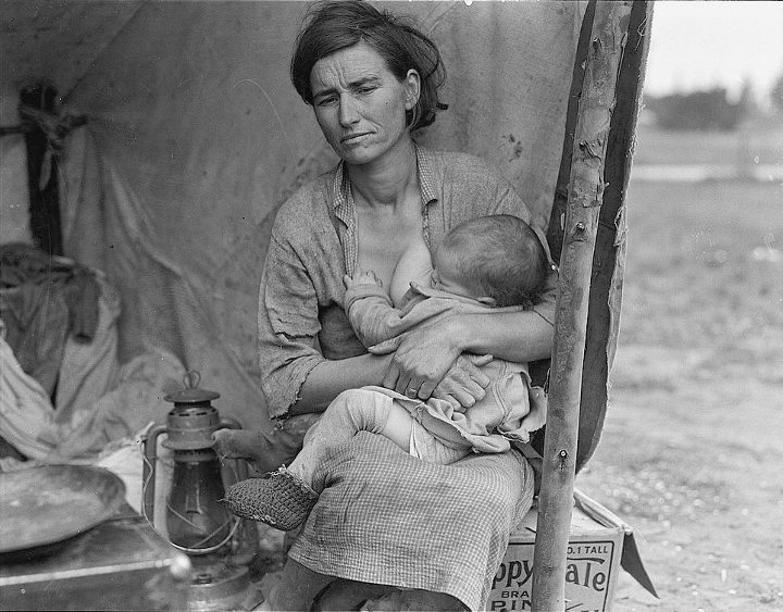It is perhaps the most famous photograph from the depression. The semi official title is Migrant Mother. The Library of Congress says “Destitute pea pickers in California. Mother of seven children. Age thirty-two. Nipomo, California.” The exact date is unknown, and was either February or March of 1936. The photographer was Dorothea Lange (pronounced dore-THEE-ah lang). The model was Florence Owens Thompson .