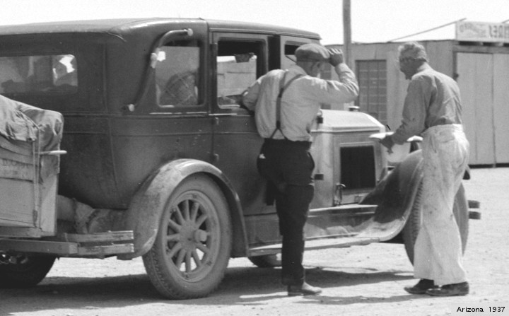 The day Lange photographed Thompson, she and her family were driving towards Watsonville, hoping to pick lettuce in the Pajaro Valley. The timing chain on their car broke just outside Nipomo, and so they pulled into the pea -pickers camp to fix it. While fixing the chain, the radiator was punctured; Thompson’s two boys (and likely her male companion) (Wikipedia says it was husband Jim Hill) brought the radiator into town to be fixed. While they were gone, Lange arrived…
