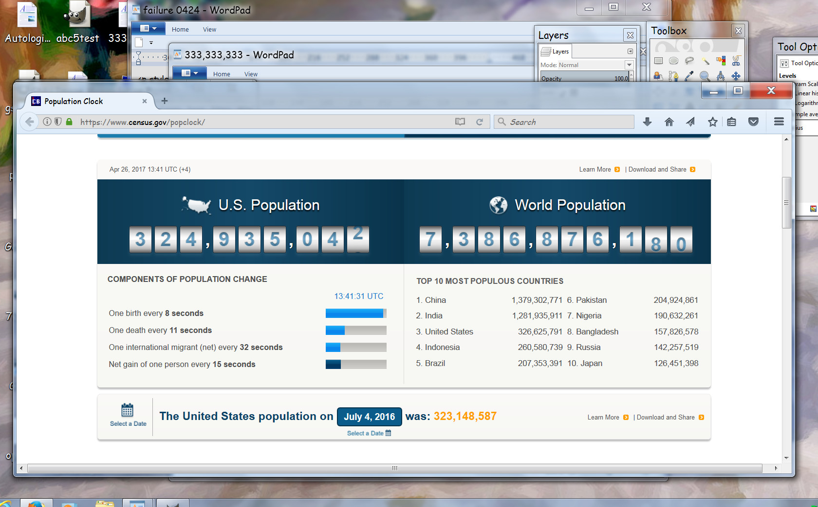 The question for today is: When will the US population hit 333,333,333? Here are some hints: “Components of Population Change: One birth every 8 seconds, One death every 11 seconds, One international migrant (net) every 32 seconds, Net gain of one person every 15 seconds.”