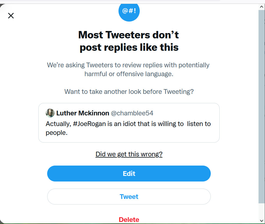 This content was posted October 16, 2022. … @BrandonLBradfor “The larger your platform the more I think you have a moral obligation to the people that listen to you. I give Rogan criticism but he’s just an idiot that’s willing to talk to people, Kanye is a vindictive, desperate, dumbass, and don’t blame this on his mental health.” @chamblee54 “Actually, Joe R**** is an i**** who is willing to listen to people. Twitter questioned my first reply. I censored the two words that were possibly offensive. If listen is offensive, then I am in trouble.”