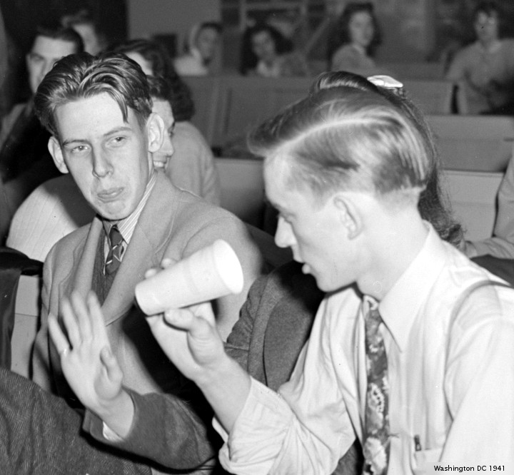The Library of Congress supplies the pictures for today’s frolic. “Group singing hymns at the opening of the Sunday school. While there are no churches on the project there are five or six in the area close by. This one is just off the project and is attended by many project members. Dailey, West Virginia” Arthur Rothstein took the pictures in December, 1941.