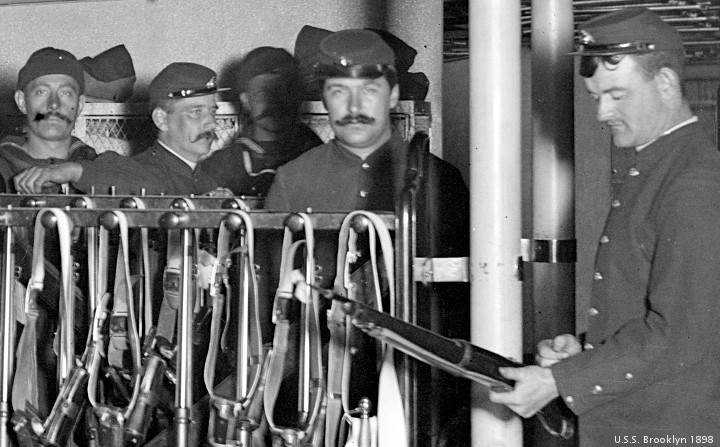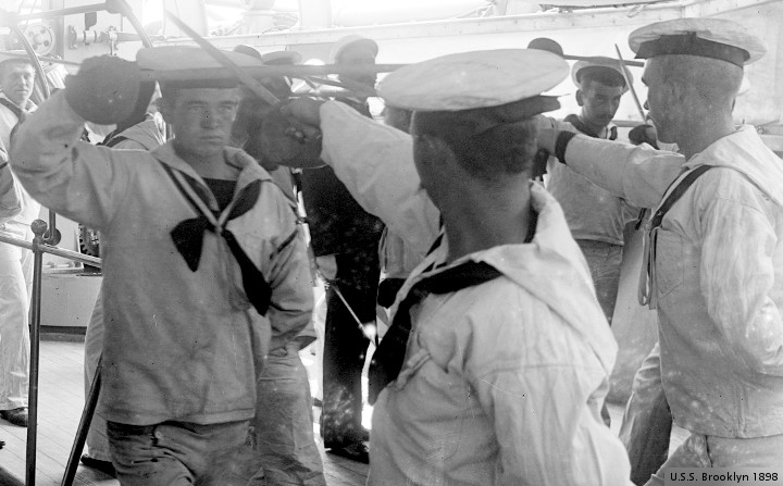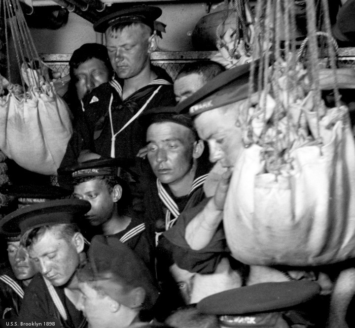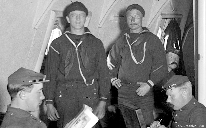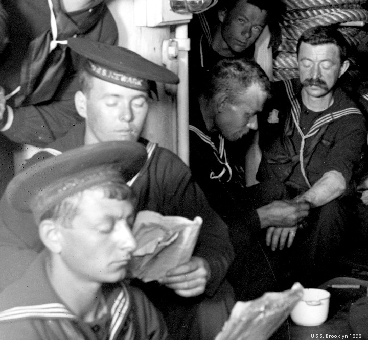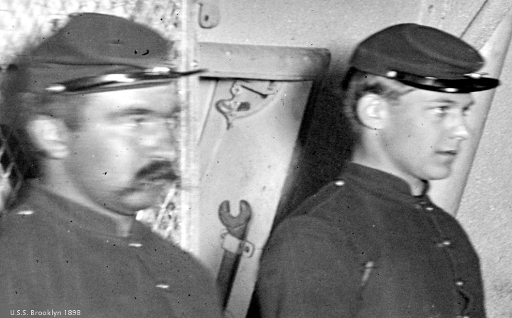 The Library of Congress provides the images to be edited this morning. They are opened with GIMP, and cropped to an appropriate size. The light/dark levels are adjusted, and a label is pasted into the corner. The first pictures today are from a series shot “between 1896 and 1899.” U.S.S. Brooklyn, just before turning in. ” Edward H. Hart, photographer, Detroit Publishing Co. , publisher “