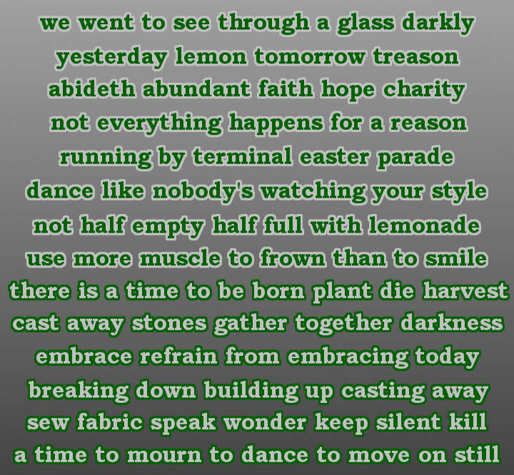 PG had a tough time in the first game. He drew a lot of vowels, and never did get caught up. In the second game he did better, and called out for everyone to draw another tile often. This is done by saying a banana related word, like peel or stem. PG was reminded of this safe word often, but cannot remember it now. Here are the five poems.