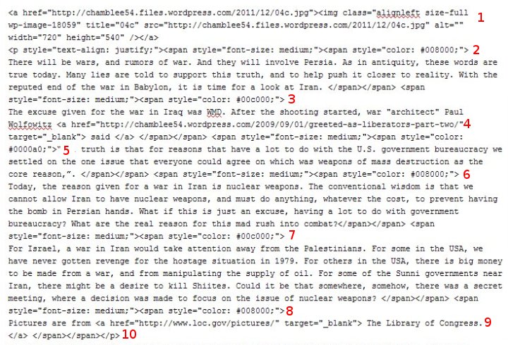 To show how these codes work, we will use screen shots from a post, Why Do Some Want A War In Iran? . The first picture is the HTML for this post. This is what you see when you click on the HTML tab in the editing window. The second picture is the post, as it appears online. There will be numbers on these pictures, which will correspond to notes in this text. Other pictures will be from The Library of Congress .